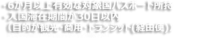 必ずお客様の渡航がETAの適用条件を満たしているかをご自身でご確認いただき、当サイトのサービス概要、価格、利用規約に同意の上お申し込みください。日本国籍の場合、最大30日までの短期商用と観光ならびに最大48時間までのトランジットはビザ(査証)が免除されETAでの渡航となります。